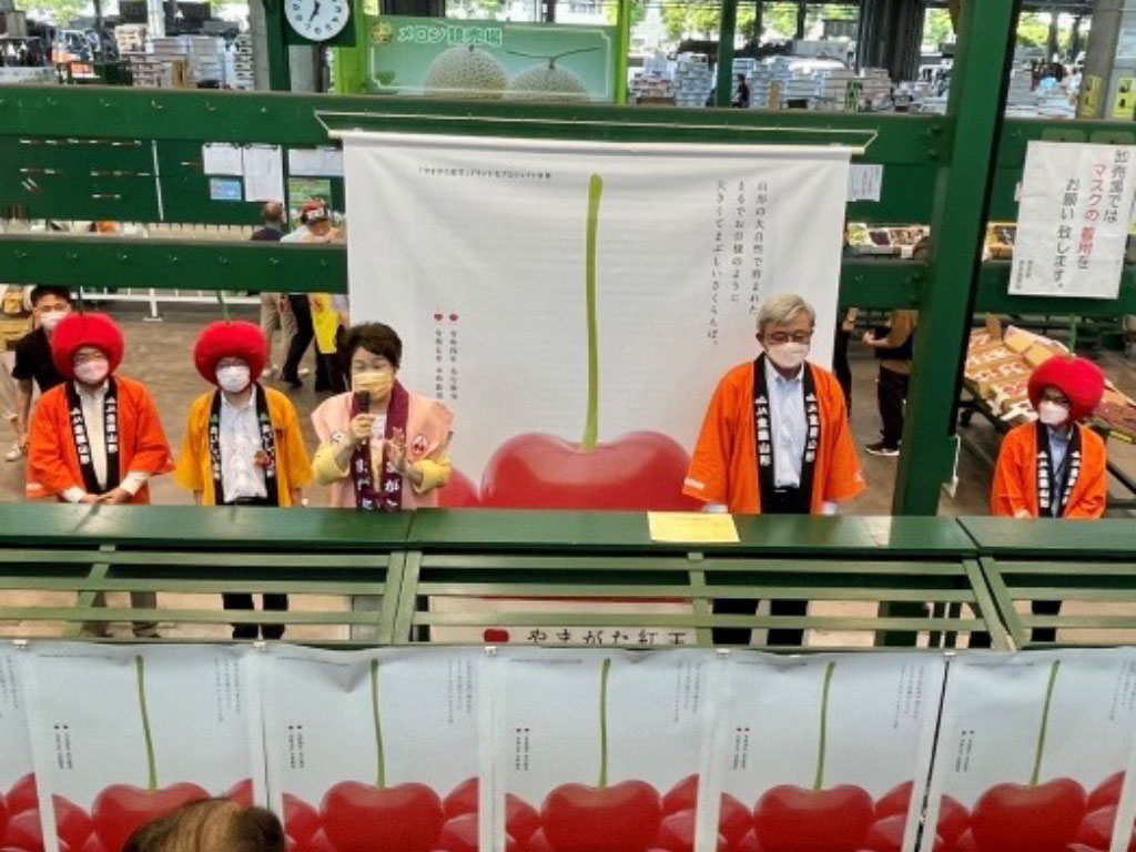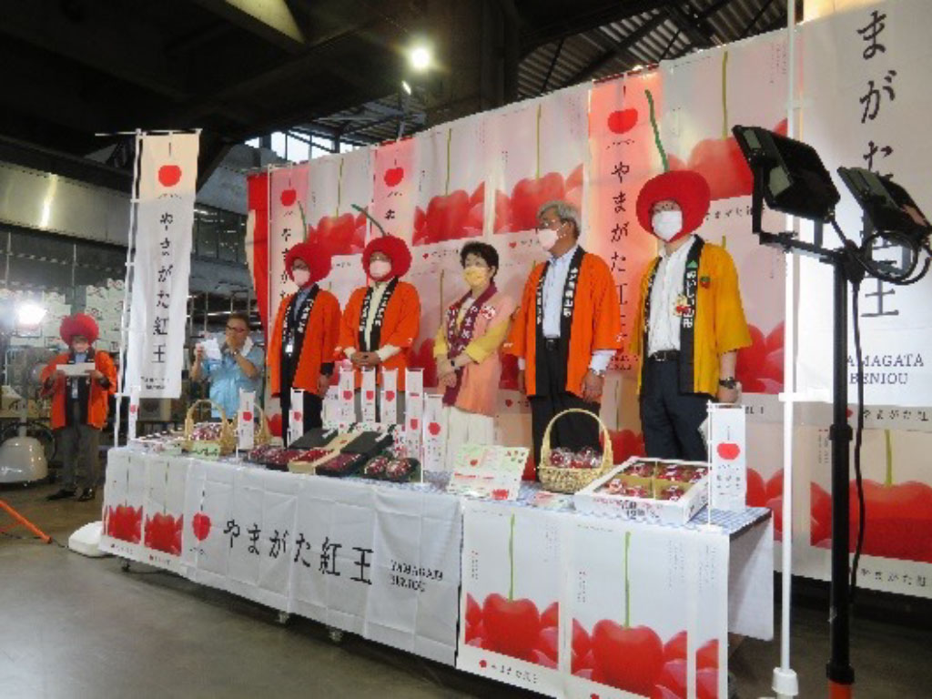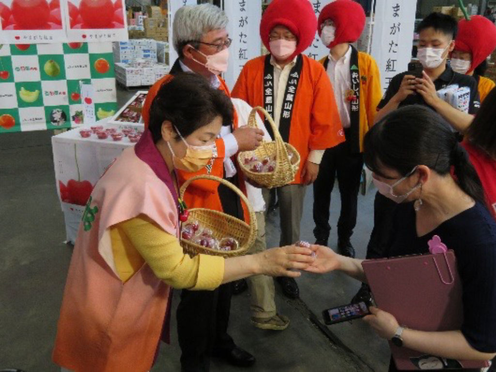 おいしい山形推進機構とJA全農山形は7月1日、東京都中央卸売市場大田市場で、「やまがた紅王」のトップセールスを行ないました。 吉村知事とJA全農山形の折原会長らが「山形期待の新品種、おいしさを是非確かめて」と呼びかけながら、市場関係者に「やまがた紅王」を振舞いました。