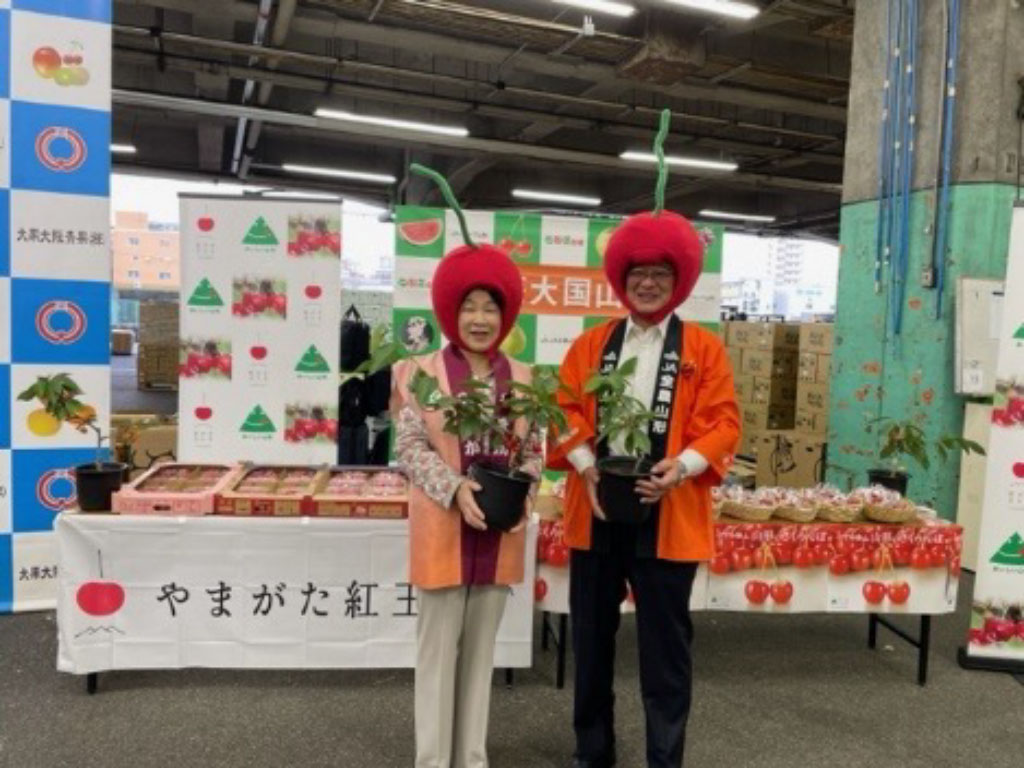 6月9日(金)、東京都中央卸売市場大田市場、翌10日(土)には、大阪市中央卸売市場において、吉村知事がJA全農山形折原会長とともに、県産さくらんぼのトップセールスを行いました。吉村知事は、今年本格デビューを迎えた「やまがた紅王」の大玉でツヤがあり、食味が良好で、果肉がしっかりし、日持ち性が優れるなどの特長や県産さくらんぼのおいしさなどを市場関係者に強力にアピールしました。